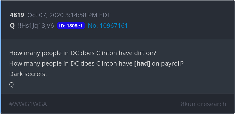 How many people in DC does Clinton have dirt on? How many people in DC does Clinton have [had] on payroll? Dark secrets.