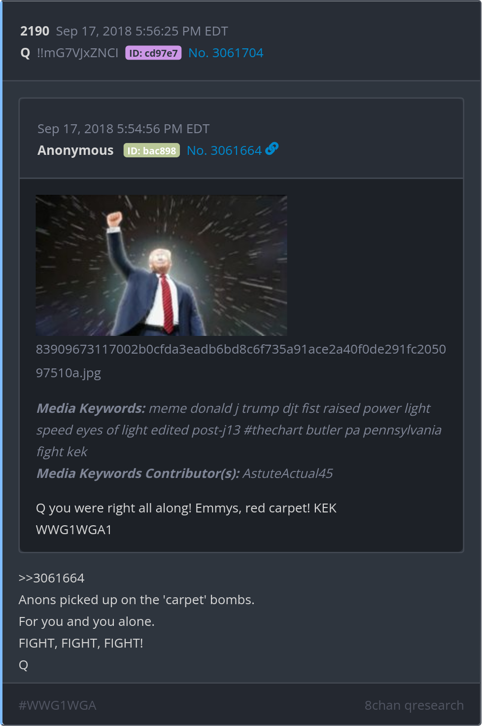 Anons picked up on the 'carpet' bombs. For you and you alone. FIGHT, FIGHT, FIGHT! Posted 09/17/2024 01:30 PM Categories Clips, Q