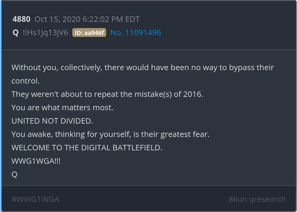 You awake, thinking for yourself, is their greatest fear. WELCOME TO THE DIGITAL BATTLEFIELD. WWG1WGA!!! Posted 10/15/2024 10:05 AM Categories Clips, Q