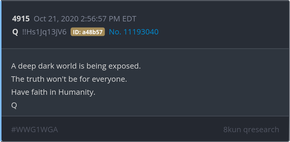 A deep dark world is being exposed. The truth won't be for everyone. Have faith in Humanity. Posted 10/20/2024 10:38 PM Categories Clips, Q