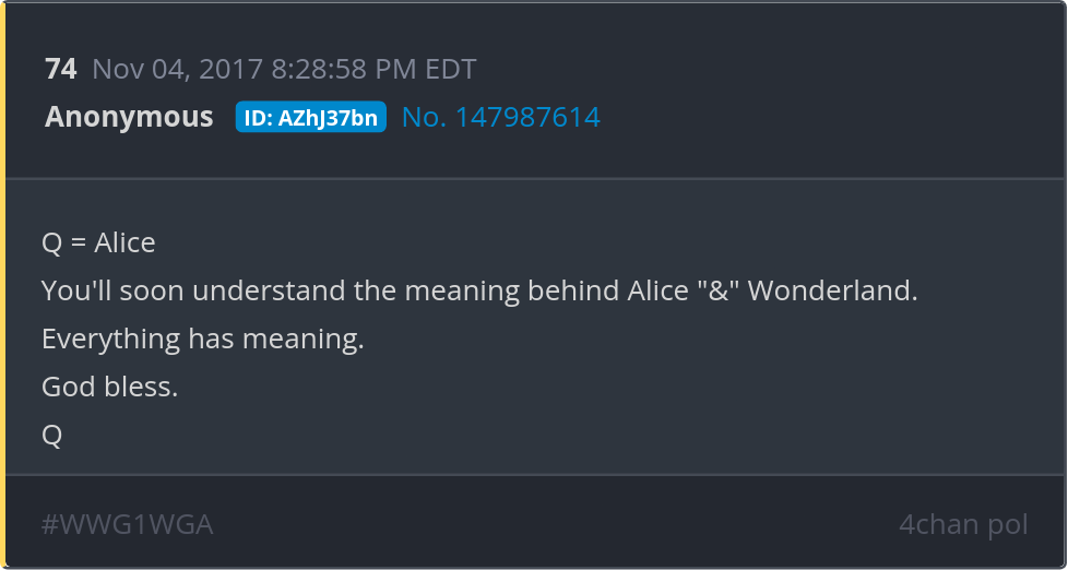 Q = Alice. You'll soon understand the meaning behind Alice "&" Wonderland. Everything has meaning. God bless. Posted 11/03/2024 08:49 PM Categories Clips, Q