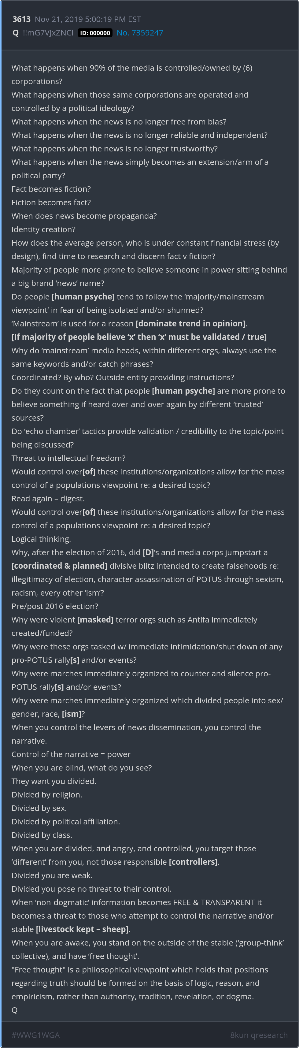 What happens when 90% of the media is controlled/owned by (6) corporations? What happens when those same corporations are operated and controlled by a political ideology? Posted 11/21/2024 08:59 PM Categories Clips, Q