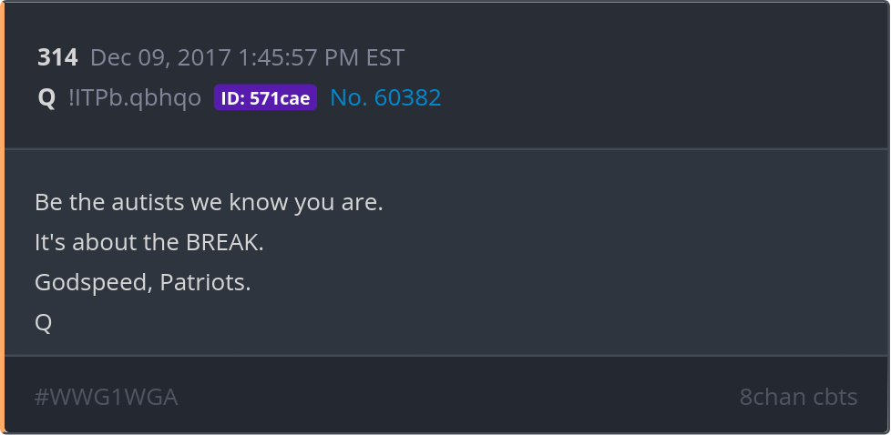 Be the autists we know you are. It's about the BREAK. Godspeed, Patriots. Posted 12/08/2024 09:18 PM Categories Clips, Q