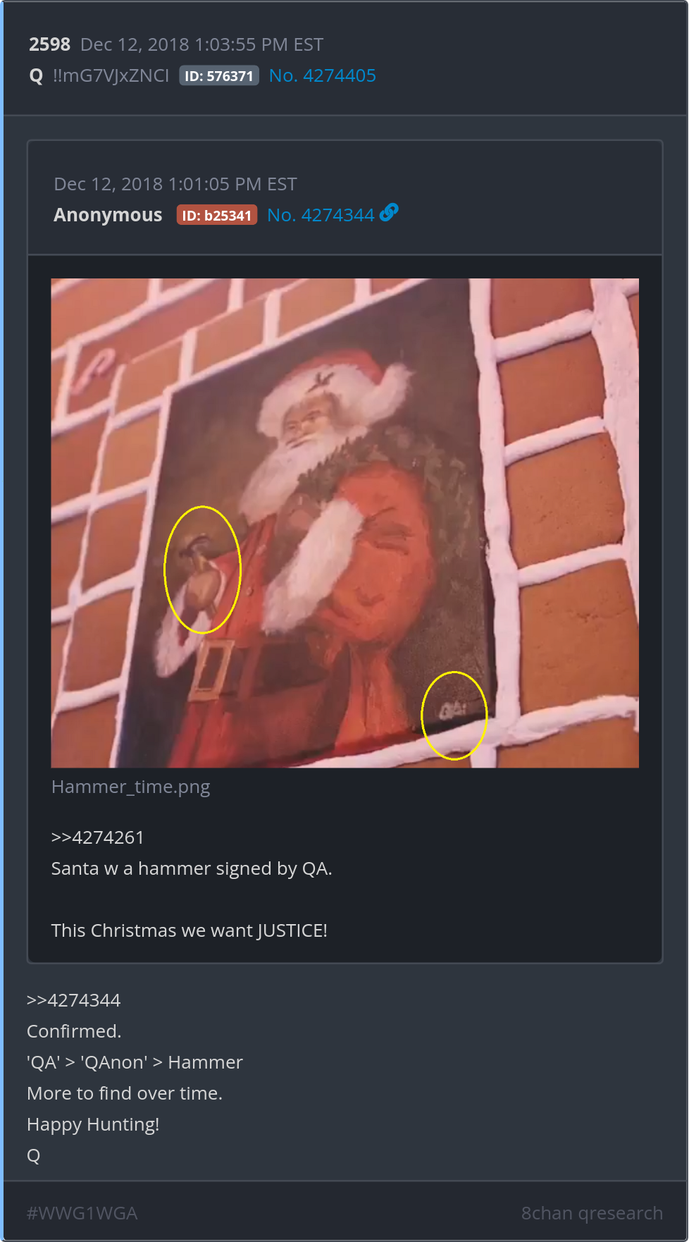 Santa w a hammer signed by QA. This Christmas we want JUSTICE! Posted 12/11/2024 09:54 PM Categories Clips, Q