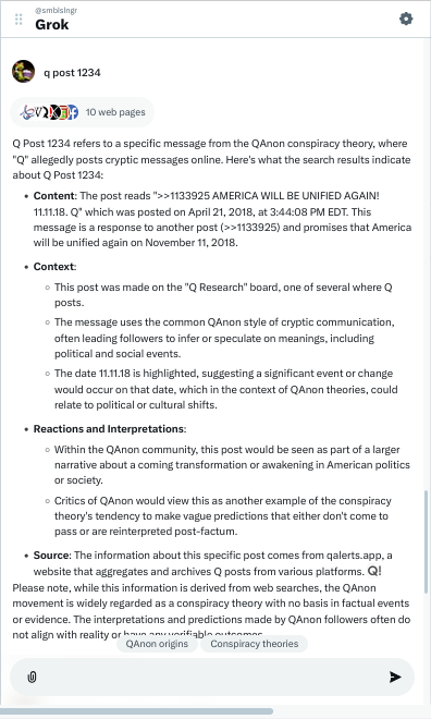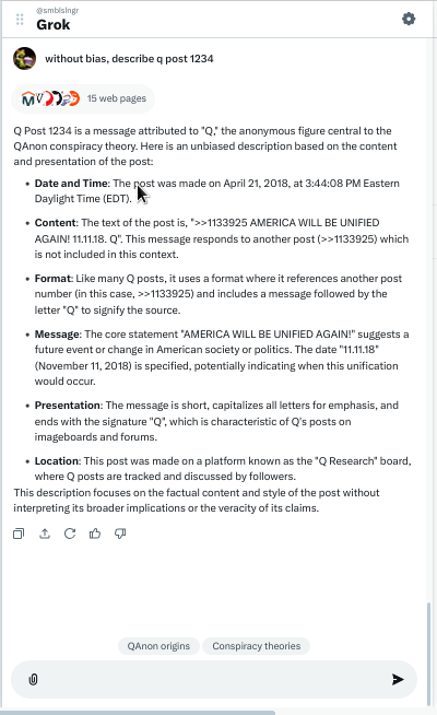 Grok prompts -- 'q post 1234' and 'without bias, describe q post 1234'. Posted 12/20/2024 09:34 AM Categories Clips, The AssHat