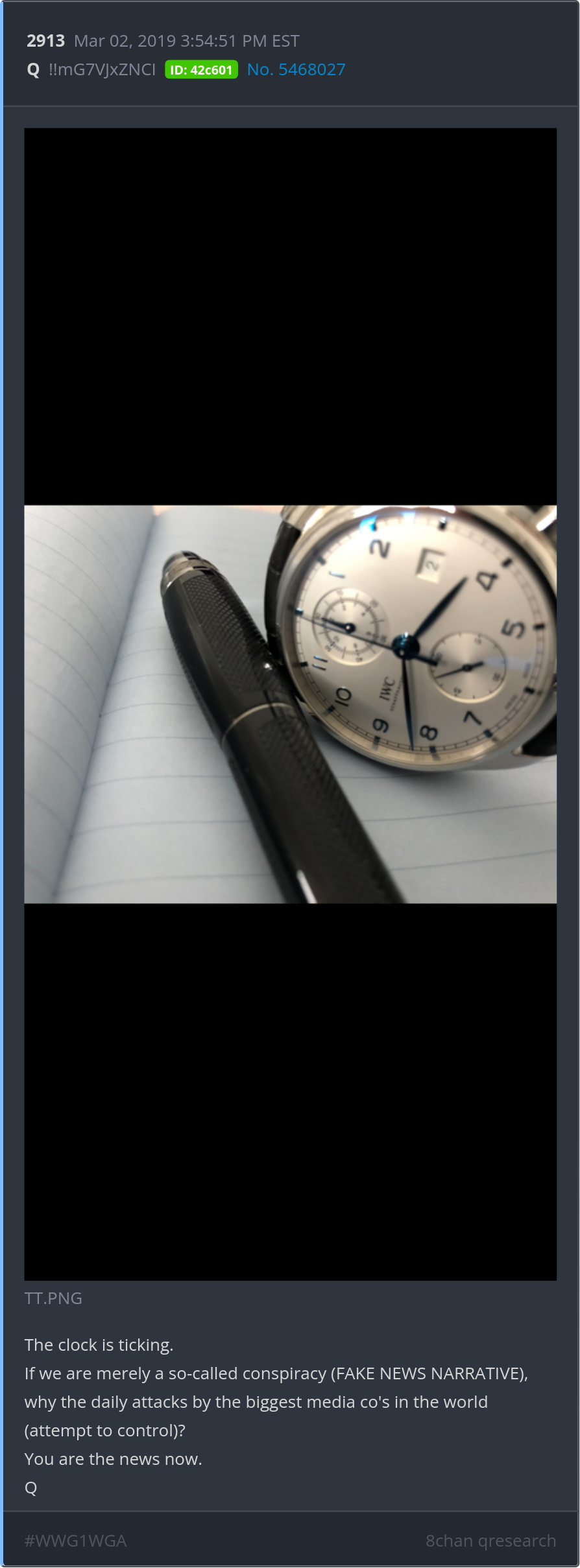 The clock is ticking. If we are merely a so-called conspiracy (FAKE NEWS NARRATIVE), why the daily attacks by the biggest media co's in the world (attempt to control)? You are the news now. Posted 03/02/2025 05:22 PM Categories Clips, Q