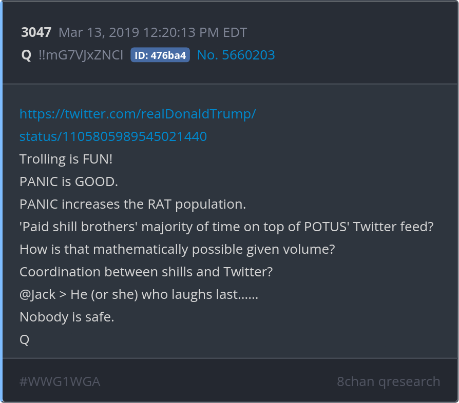 Trolling is FUN! PANIC is GOOD. PANIC increases the RAT population. https://twitter.com/realDonaldTrump/status/1105805989545021440 Posted 03/12/2025 09:13 PM Categories Clips, Q