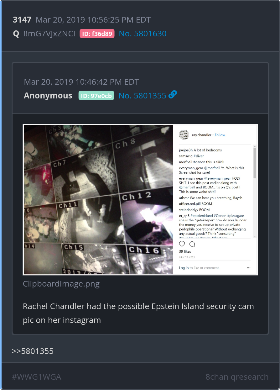 Rachel Chandler had the possible Epstein Island security cam pic on her instagram Posted 03/19/2025 10:00 PM Categories Clips, Q