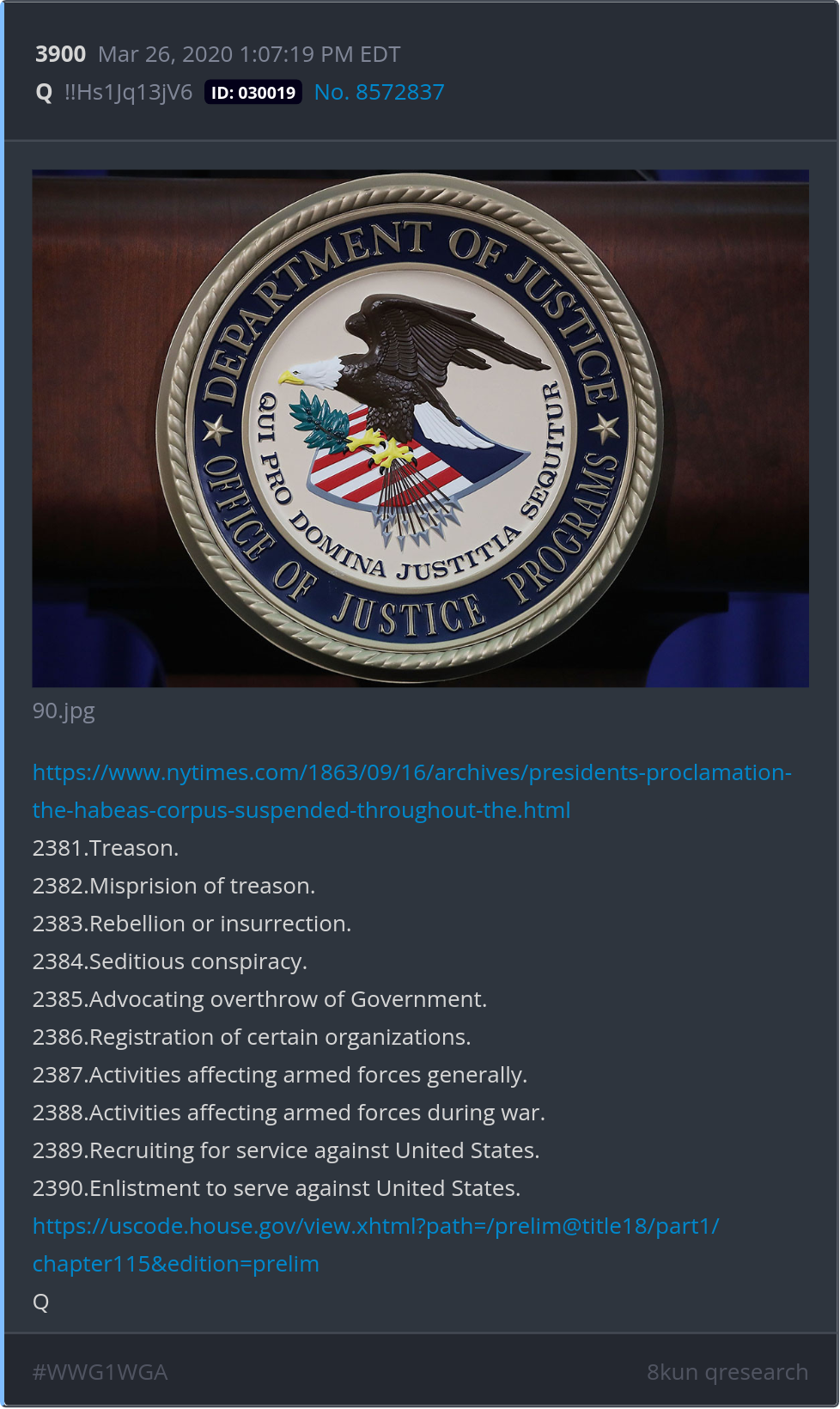 2381.Treason. https://www.nytimes.com/1863/09/16/archives/presidents-proclamation-the-habeas-corpus-suspended-throughout-the.html https://uscode.house.gov/view.xhtml?path=/prelim@title18/part1/chapter115&edition=prelim Posted 03/25/2025 07:16 PM Categories Clips, Q