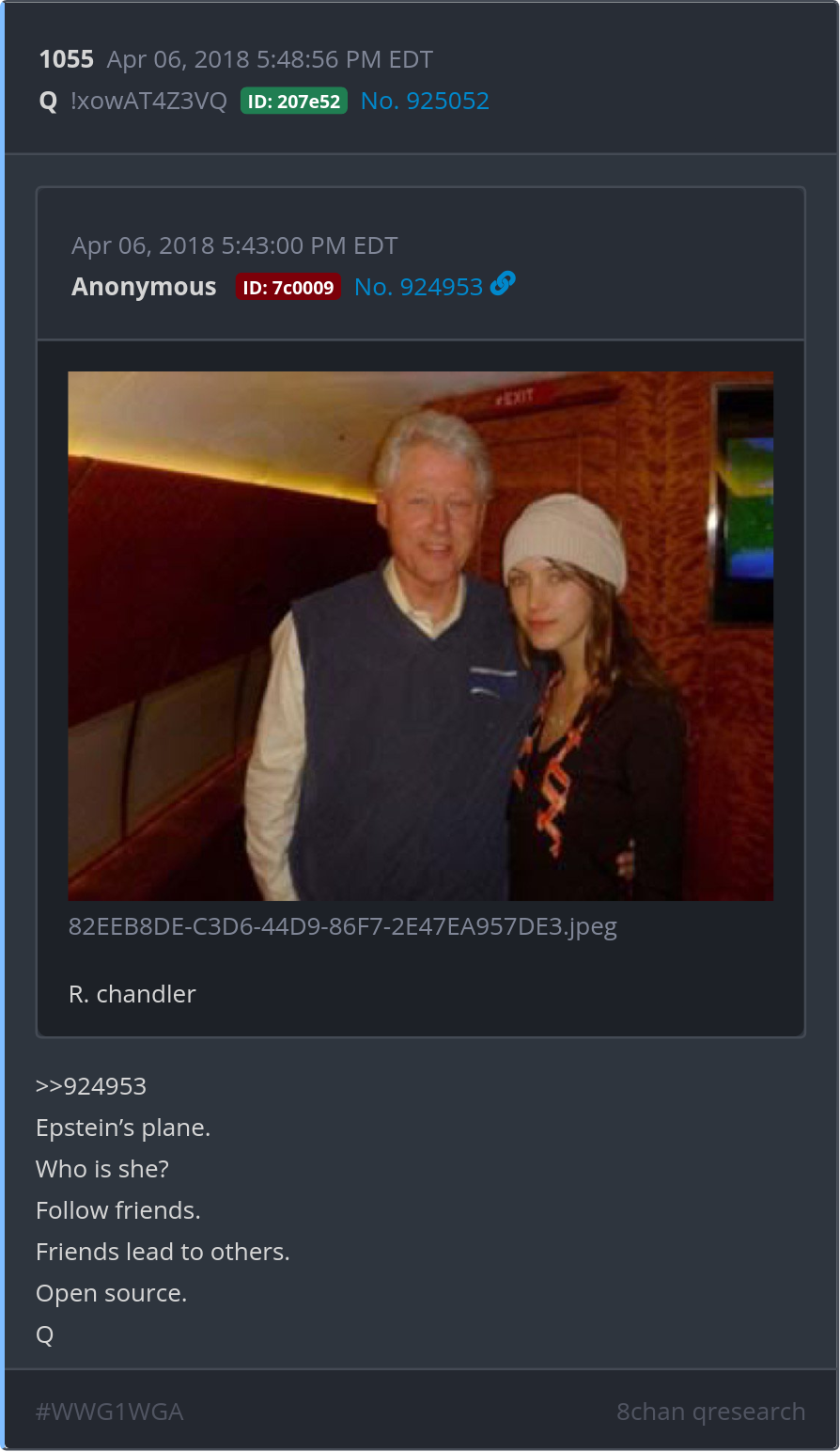 Epstein’s plane. Who is she? Follow friends. Friends lead to others. Open source. Posted 04/05/2025 07:56 PM Categories Clips, Q