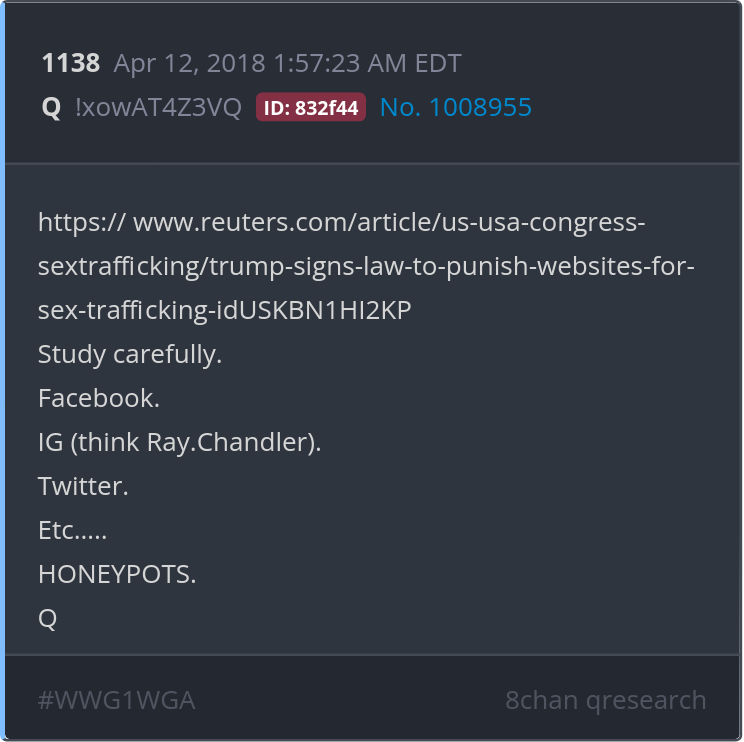 Study carefully. Facebook. IG (think Ray.Chandler). Twitter. Etc….. HONEYPOTS. https://www.reuters.com/article/us-usa-congress-sextrafficking/trump-signs-law-to-punish-websites-for-sex-trafficking-idUSKBN1HI2KP/ Posted 04/11/2025 09:09 PM Categories Clips, Q