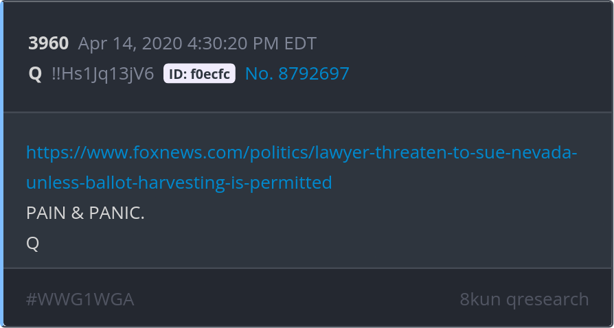 PAIN & PANIC. https://www.foxnews.com/politics/lawyer-threaten-to-sue-nevada-unless-ballot-harvesting-is-permitted Posted 04/13/2025 08:35 PM Categories Clips, Q
