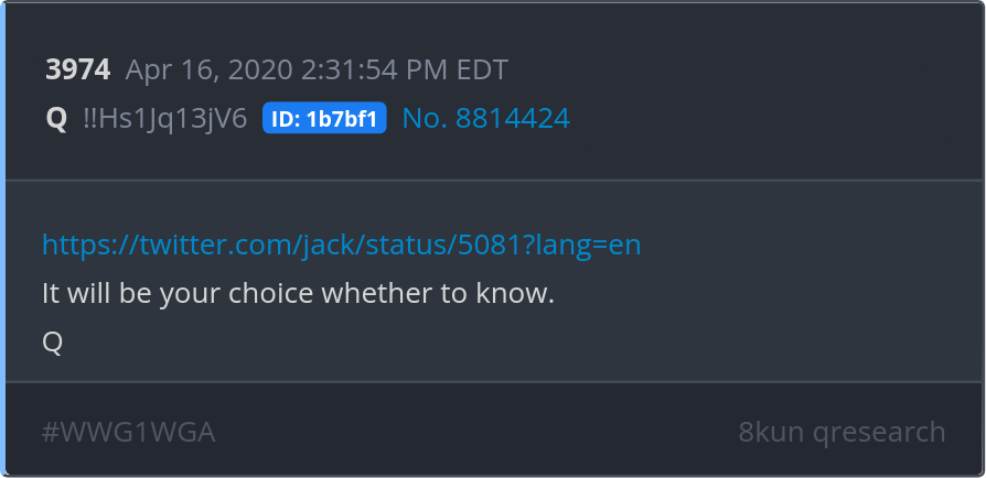 It will be your choice whether to know. https://twitter.com/jack/status/5081?lang=en Posted 04/15/2025 09:23 PM Categories Clips, Q
