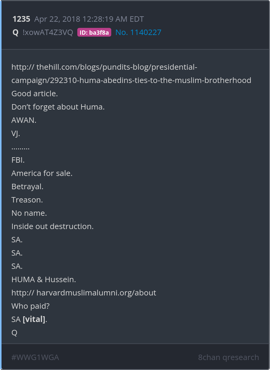 FBI. America for sale. Betrayal. Treason. No name. Inside out destruction. https://thehill.com/blogs/pundits-blog/presidential-campaign/292310-huma-abedins-ties-to-the-muslim-brotherhood/ Posted 04/21/2025 09:26 PM Categories Clips, Q