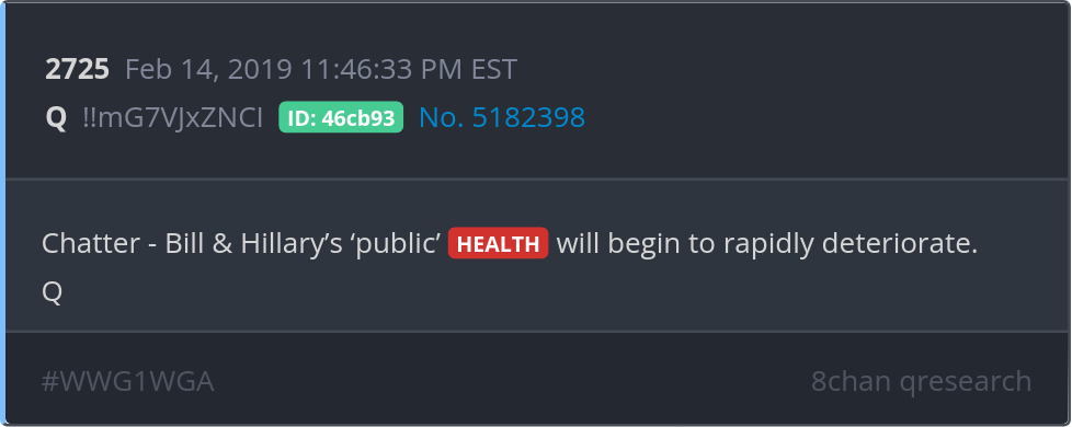Chatter - Bill & Hillary’s ‘public’ HEALTH will begin to rapidly deteriorate. Posted 04/24/2025 01:45 PM Categories Clips, Q
