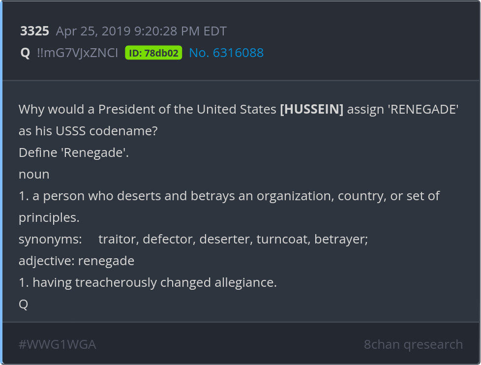 Why would a President of the United States [HUSSEIN] assign 'RENEGADE' as his USSS codename? Posted 04/24/2025 08:29 PM Categories Clips, Q