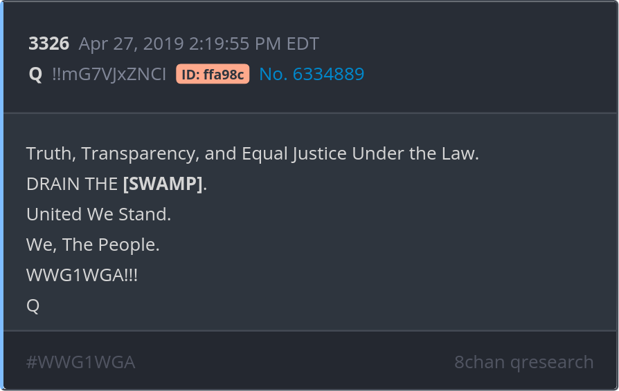 Truth, Transparency, and Equal Justice Under the Law. DRAIN THE [SWAMP]. United We Stand. We, The People. WWG1WGA!!! Posted 04/26/2025 09:42 PM Categories Clips, Q