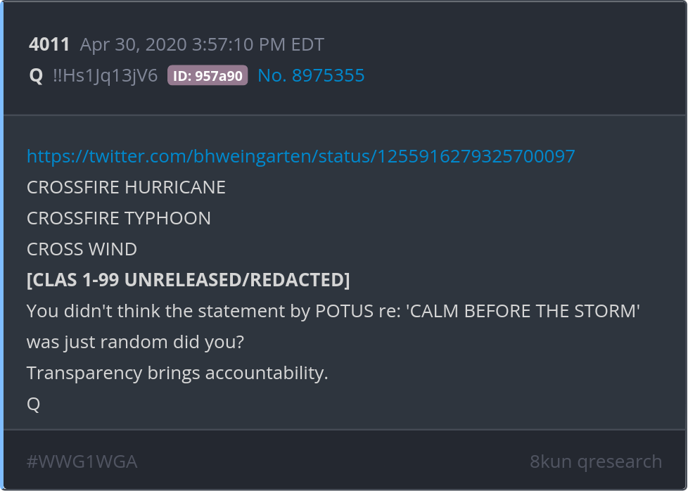 You didn't think the statement by POTUS re: 'CALM BEFORE THE STORM' was just random did you? Transparency brings accountability. Posted 04/29/2025 08:41 PM Categories Clips, Q