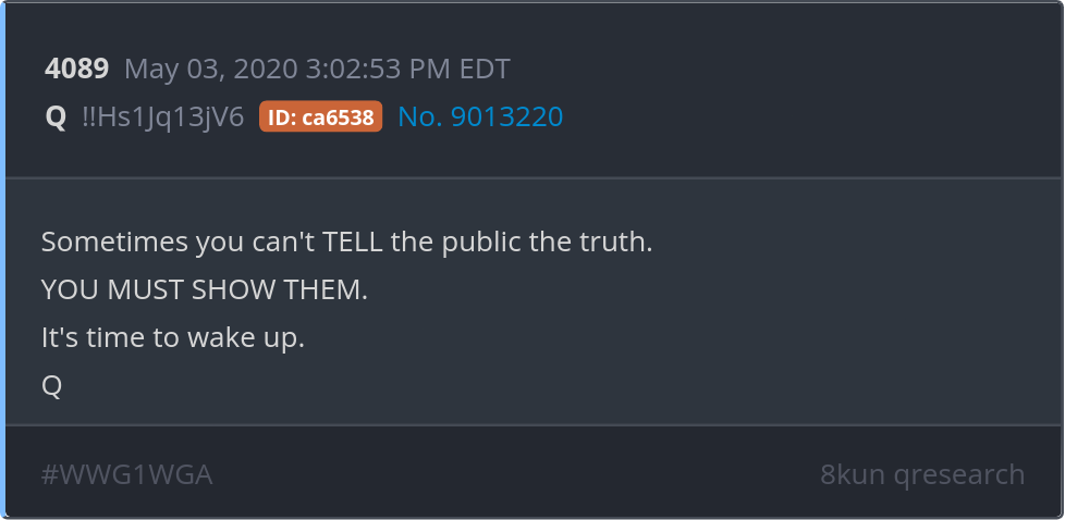 Sometimes you can't TELL the public the truth. YOU MUST SHOW THEM. It's time to wake up. Posted 05/02/2025 09:12 PM Categories Clips, Q