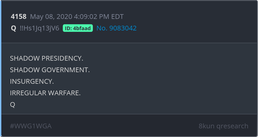 SHADOW PRESIDENCY. SHADOW GOVERNMENT. INSURGENCY. IRREGULAR WARFARE. Posted 05/07/2025 09:14 PM Categories Clips, Q