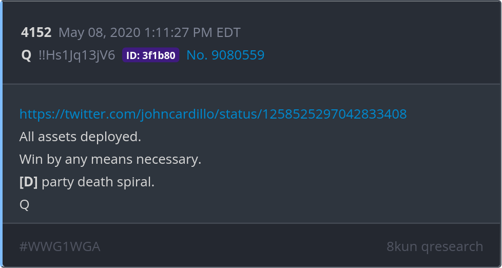 All assets deployed. Win by any means necessary. [D] party death spiral. https://twitter.com/johncardillo/status/1258525297042833408 Posted 05/07/2025 09:17 PM Categories Clips, Q