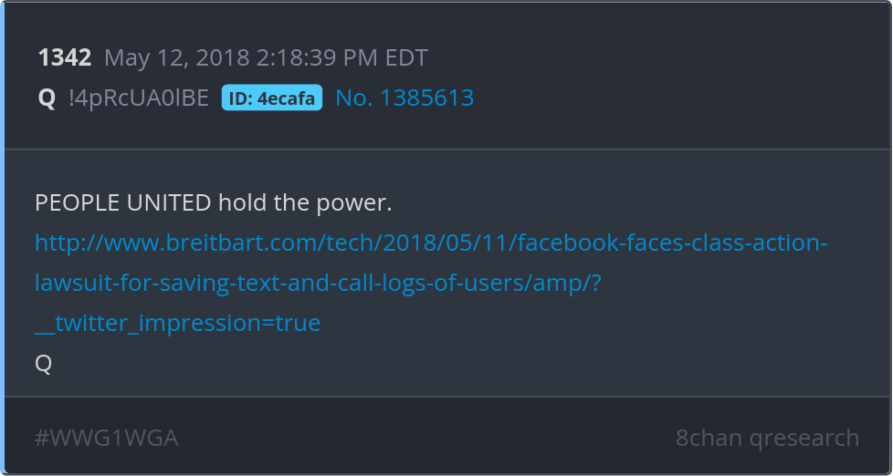 PEOPLE UNITED hold the power. http://www.breitbart.com/tech/2018/05/11/facebook-faces-class-action-lawsuit-for-saving-text-and-call-logs-of-users/amp/?__twitter_impression=true Posted 05/11/2025 08:00 PM Categories Clips, Q