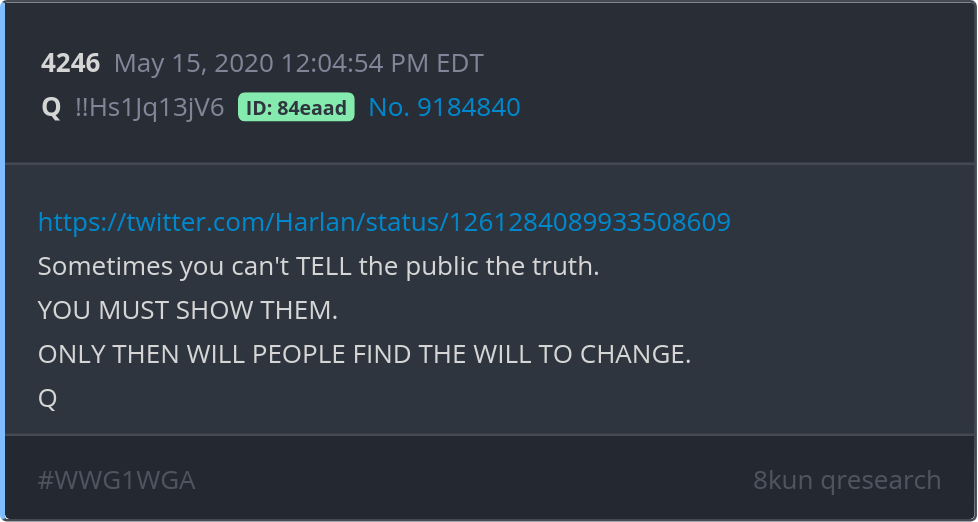 Sometimes you can't TELL the public the truth. YOU MUST SHOW THEM. ONLY THEN WILL PEOPLE FIND THE WILL TO CHANGE. https://twitter.com/Harlan/status/1261284089933508609 Posted 05/14/2025 08:53 PM Categories Clips, Q