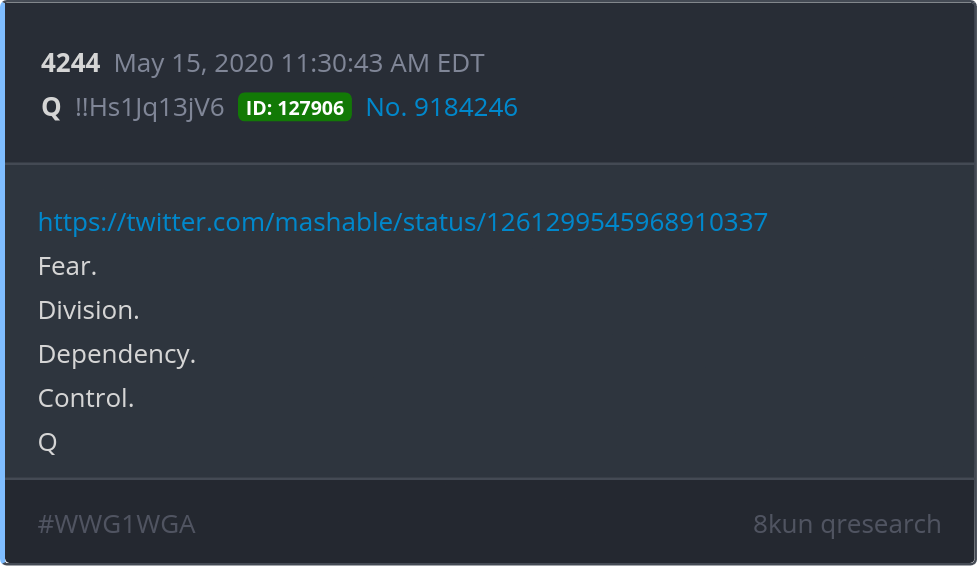 Fear. Division. Dependency. Control. https://twitter.com/mashable/status/1261299545968910337 Posted 05/14/2025 08:59 PM Categories Clips, Q
