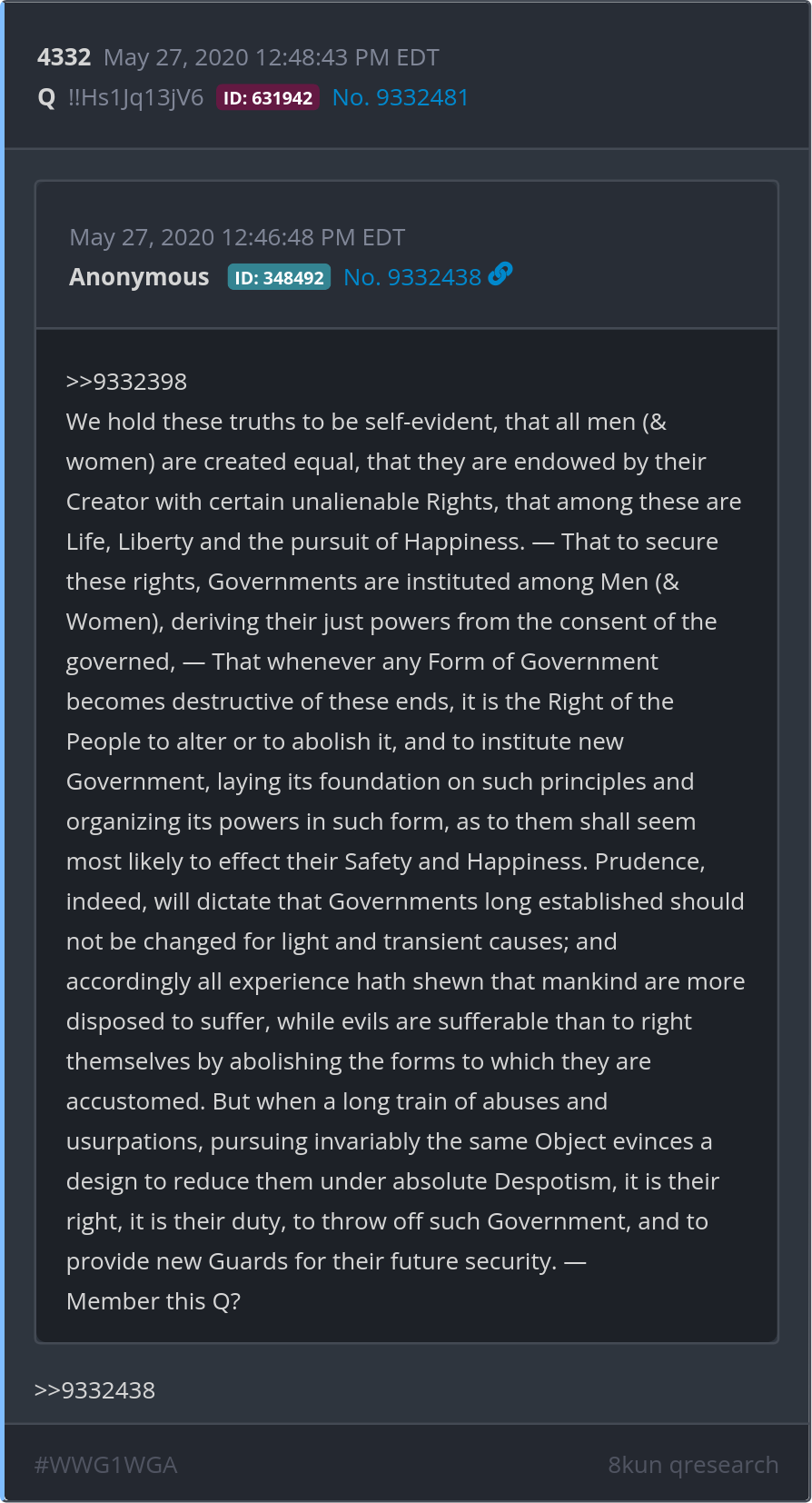 We hold these truths to be self-evident, that all men (& women) are created equal, that they are endowed by their Creator with certain unalienable Rights, that among these are Life, Liberty and the pursuit of Happiness. Posted 05/26/2025 07:59 PM Categories Clips, Q