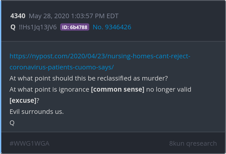 At what point should this be reclassified as murder? https://nypost.com/2020/04/23/nursing-homes-cant-reject-coronavirus-patients-cuomo-says/ Posted 05/27/2025 09:26 PM Categories Clips, Q