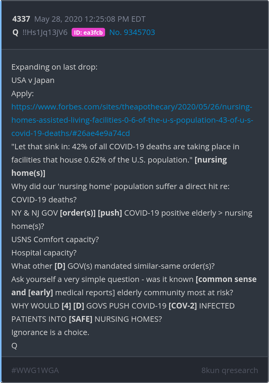 WHY WOULD [4] [D] GOVS PUSH COVID-19 [COV-2] INFECTED PATIENTS INTO [SAFE] NURSING HOMES? https://www.forbes.com/sites/theapothecary/2020/05/26/nursing-homes-assisted-living-facilities-0-6-of-the-u-s-population-43-of-u-s-covid-19-deaths/#26ae4e9a74cd Posted 05/27/2025 09:34 PM Categories Clips, Q