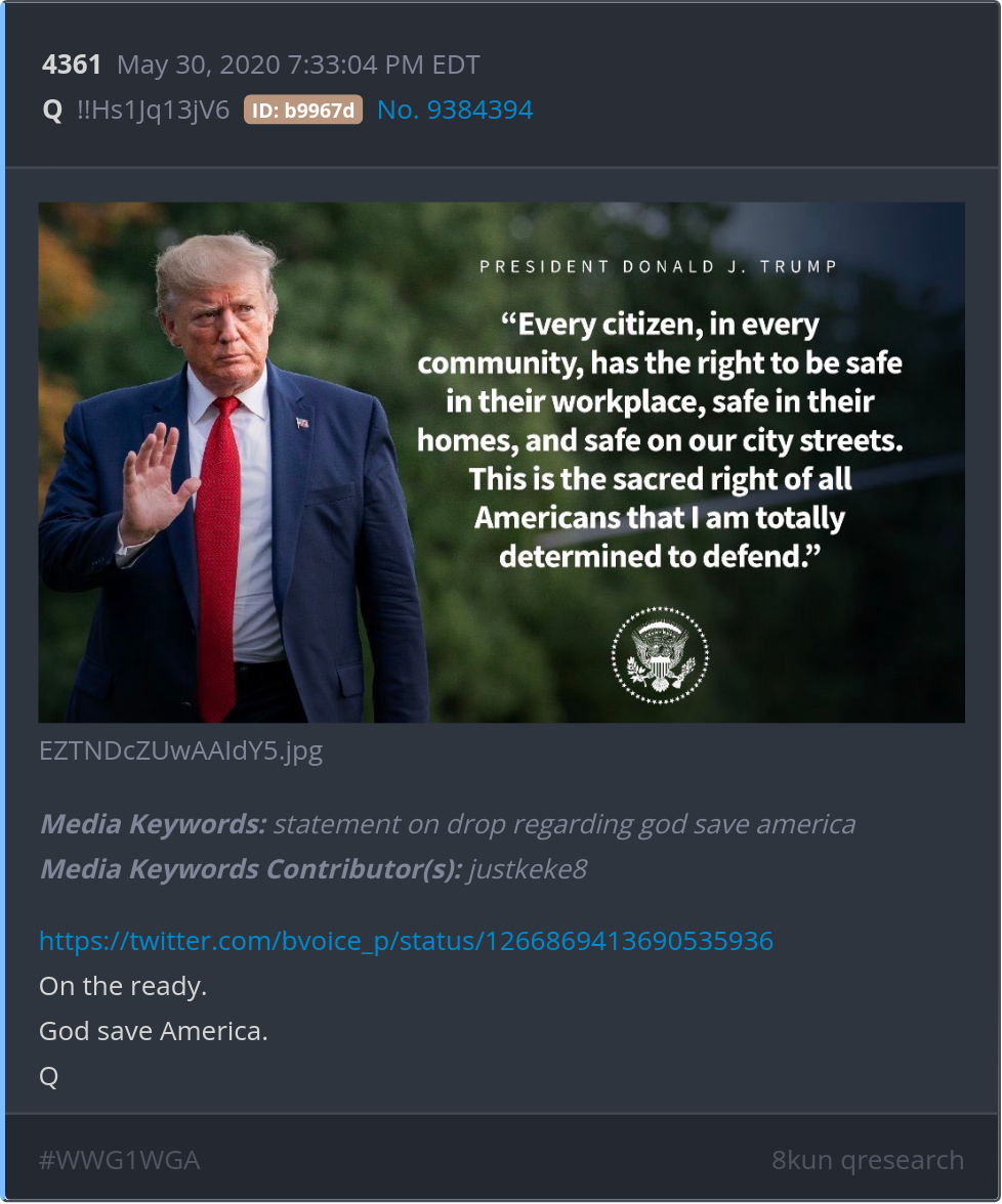 On the ready. God save America. https://twitter.com/bvoice_p/status/1266869413690535936 Posted 05/29/2025 09:08 PM Categories Clips, Q