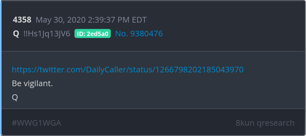 Be vigilant. https://twitter.com/DailyCaller/status/1266798202185043970 Posted 05/29/2025 09:12 PM Categories Clips, Q