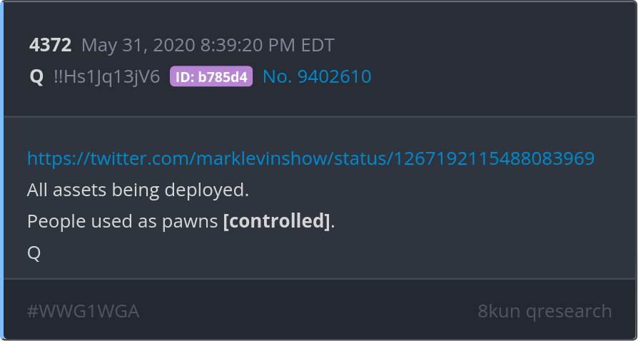 All assets being deployed. People used as pawns [controlled]. https://twitter.com/marklevinshow/status/1267192115488083969 Posted 05/30/2025 09:22 PM Categories Clips, Q