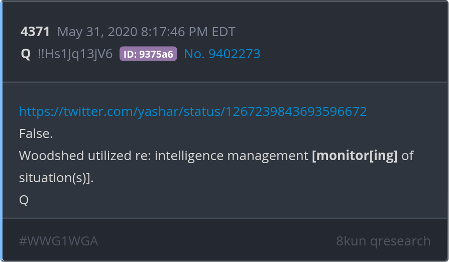 False. Woodshed utilized re: intelligence management [monitor[ing] of situation(s)]. https://twitter.com/yashar/status/1267239843693596672 Posted 05/30/2025 09:24 PM Categories Clips, Q