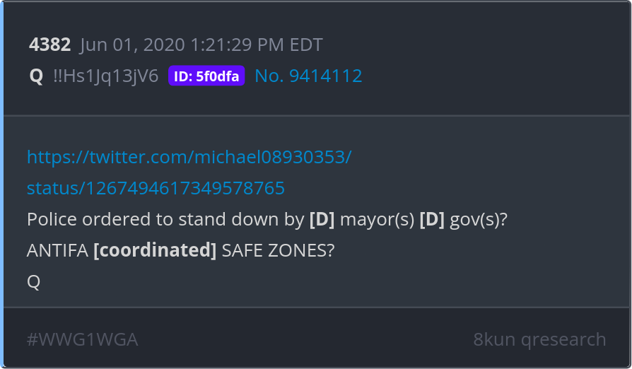 Police ordered to stand down by [D] mayor(s) [D] gov(s)? ANTIFA [coordinated] SAFE ZONES? https://twitter.com/michael08930353/status/1267494617349578765 Posted 05/31/2025 09:32 PM Categories Clips, Q