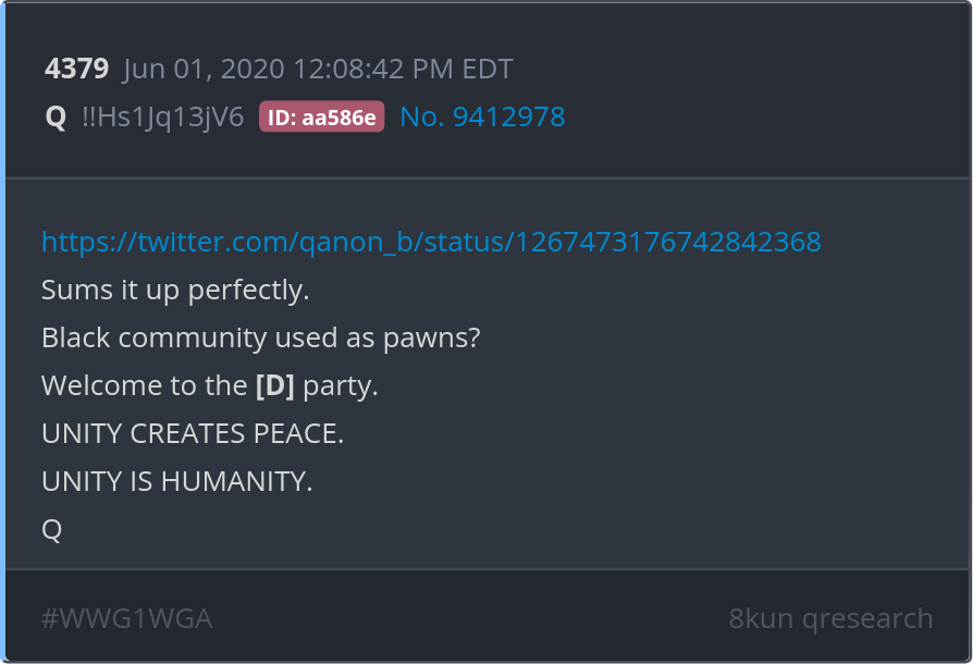 Sums it up perfectly. Black community used as pawns? Welcome to the [D] party. https://twitter.com/qanon_b/status/1267473176742842368 Posted 05/31/2025 09:39 PM Categories Clips, Q