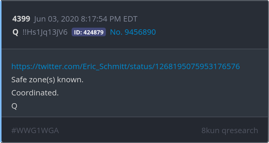 Safe zone(s) known. Coordinated. https://twitter.com/Eric_Schmitt/status/1268195075953176576 Posted 06/02/2025 09:14 PM Categories Clips, Q