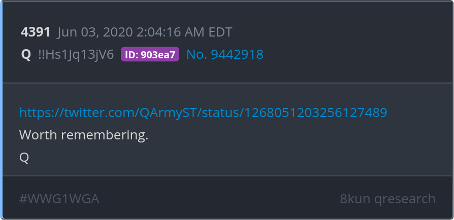 Worth remembering. https://twitter.com/QArmyST/status/1268051203256127489 Posted 06/02/2025 09:26 PM Categories Clips, Q