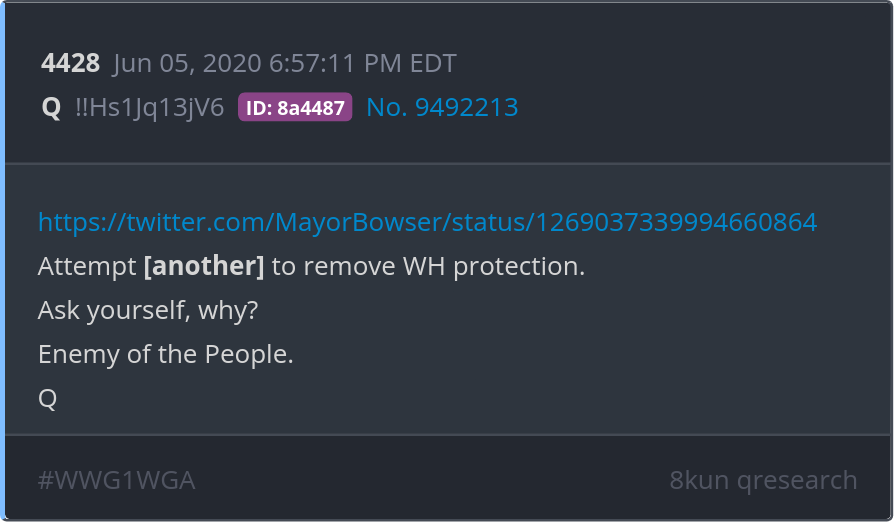 Attempt [another] to remove WH protection. Ask yourself, why? Enemy of the People. https://twitter.com/MayorBowser/status/1269037339994660864 Posted 06/04/2025 09:30 PM Categories Clips, Q