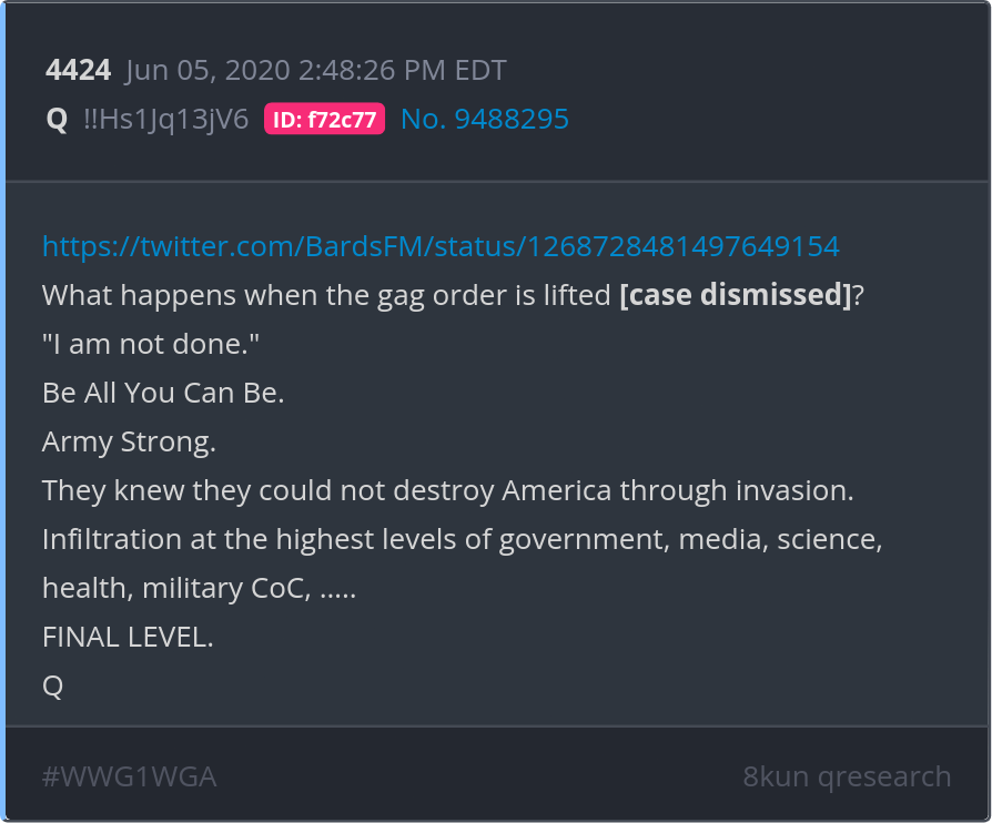 Be All You Can Be. Army Strong. They knew they could not destroy America through invasion. Infiltration at the highest levels of government, media, science, health, military CoC, ….. FINAL LEVEL. https://twitter.com/BardsFM/status/1268728481497649154 Posted 06/04/2025 09:37 PM Categories Clips, Q