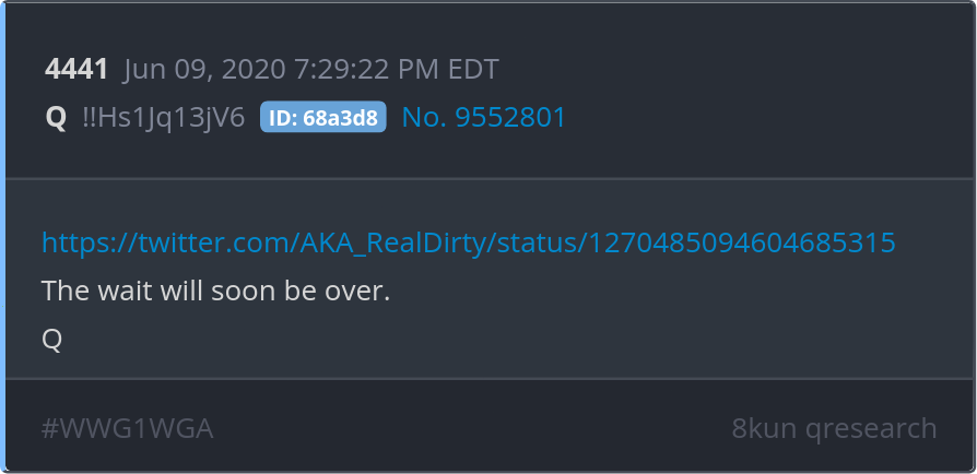 The wait will soon be over. https://twitter.com/AKA_RealDirty/status/1270485094604685315 Posted 06/08/2025 09:15 PM Categories Clips, Q