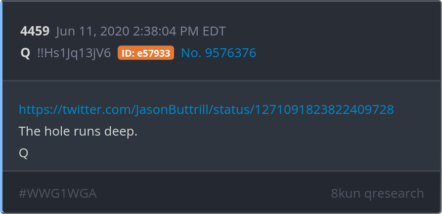 The hole runs deep. https://twitter.com/JasonButtrill/status/1271091823822409728 Posted 06/10/2025 08:51 PM Categories Clips, Q