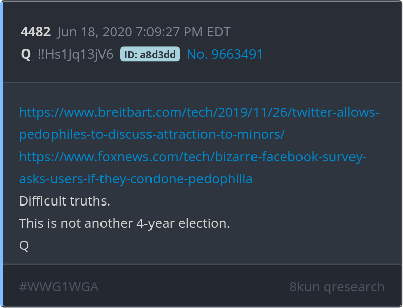 Difficult truths. This is not another 4-year election. https://www.breitbart.com/tech/2019/11/26/twitter-allows-pedophiles-to-discuss-attraction-to-minors/ https://www.foxnews.com/tech/bizarre-facebook-survey-asks-users-if-they-condone-pedophilia Posted 06/17/2025 08:59 PM Categories Clips, Q