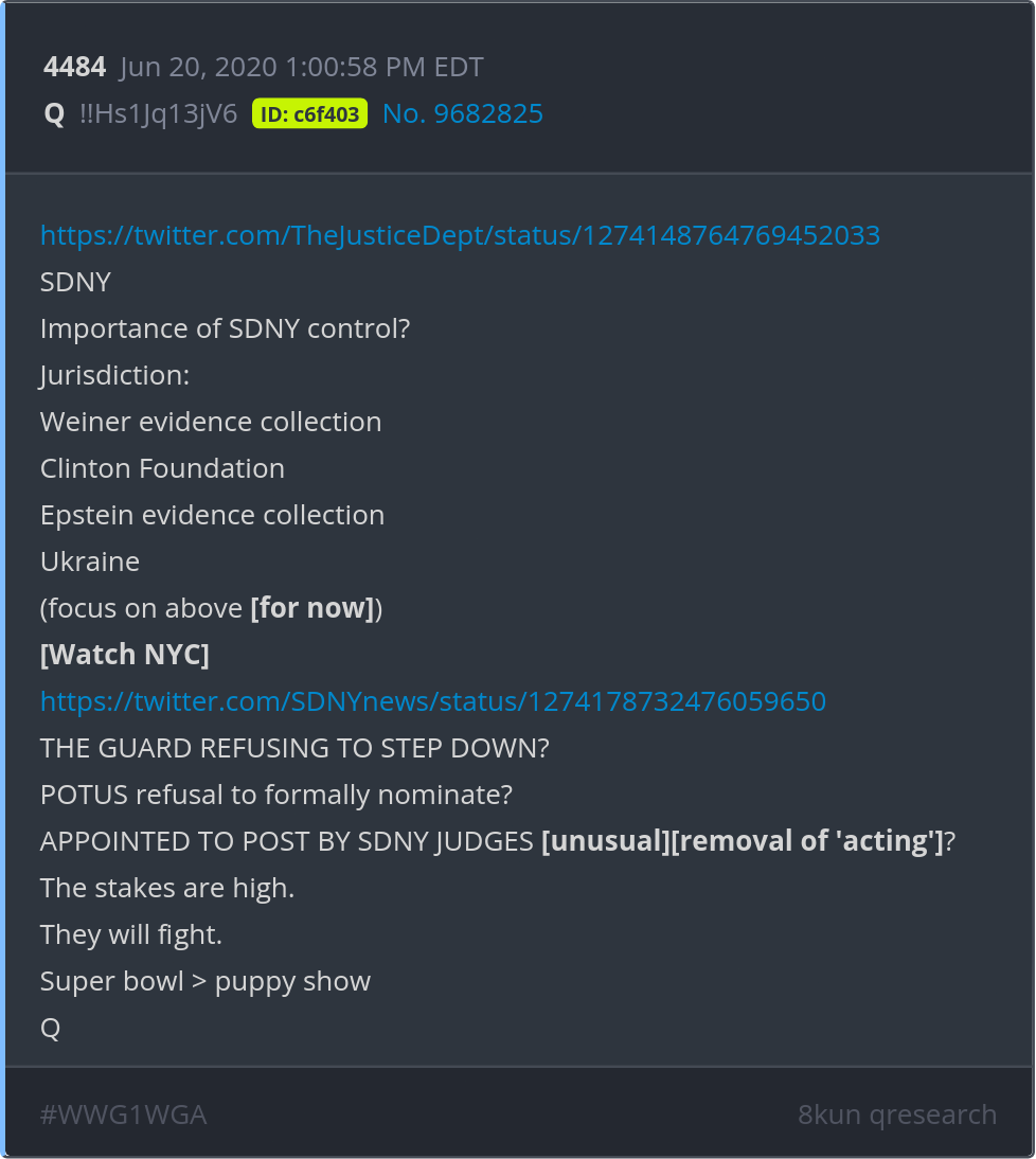 Importance of SDNY control? Jurisdiction: Weiner evidence collection. Clinton Foundation. Epstein evidence collection. Ukraine. https://twitter.com/TheJusticeDept/status/1274148764769452033 https://twitter.com/SDNYnews/status/1274178732476059650 Posted 06/19/2025 08:44 PM Categories Clips, Q