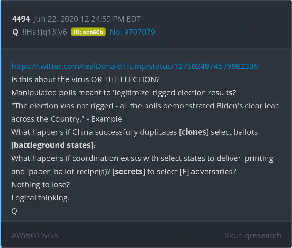 What happens if China successfully duplicates [clones] select ballots [battleground states]? What happens if coordination exists with select states to deliver 'printing' and 'paper' ballot recipe(s)? [secrets] to select [F] adversaries? https://twitter.com/realDonaldTrump/status/1275024974579982336 Posted 06/21/2025 08:46 PM Categories Clips, Q
