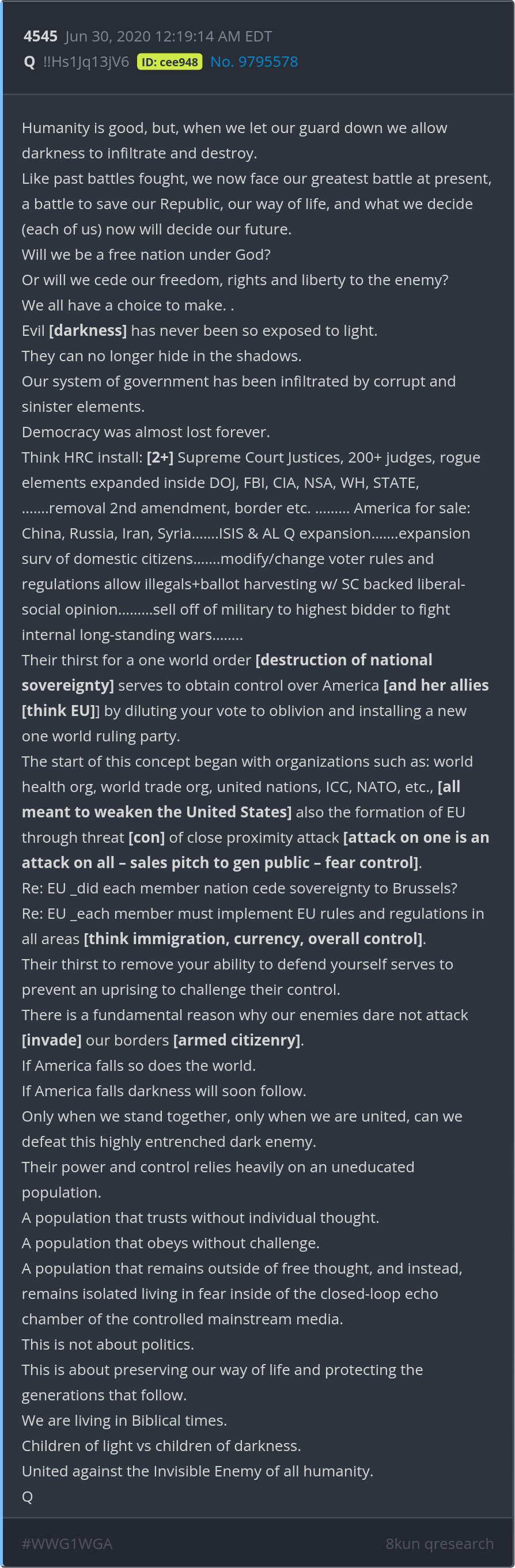 We are living in Biblical times. Children of light vs children of darkness. United against the Invisible Enemy of all humanity. Posted 06/29/2025 08:04 PM Categories Clips, Q