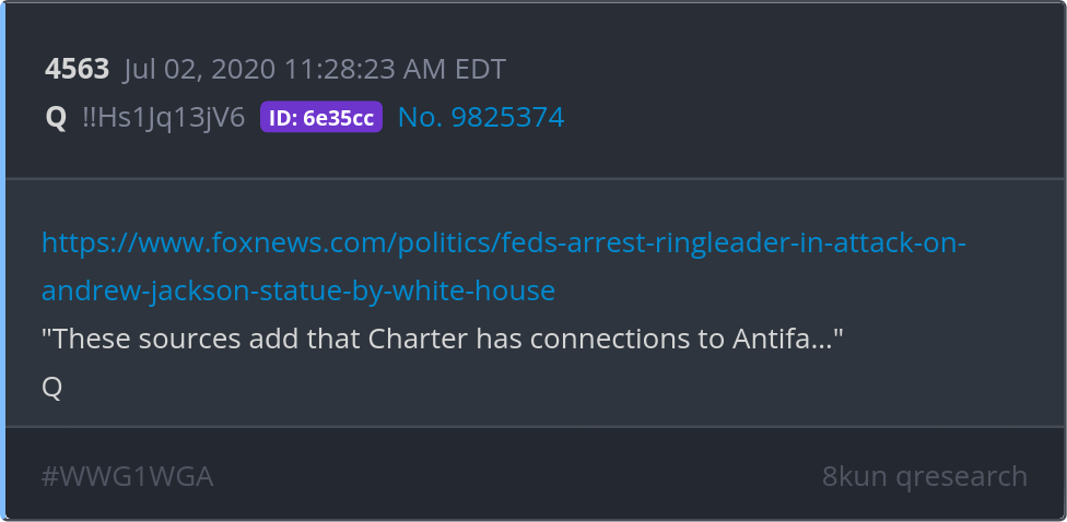 "These sources add that Charter has connections to Antifa…" https://www.foxnews.com/politics/feds-arrest-ringleader-in-attack-on-andrew-jackson-statue-by-white-house Posted 07/01/2025 09:05 PM Categories Clips, Q