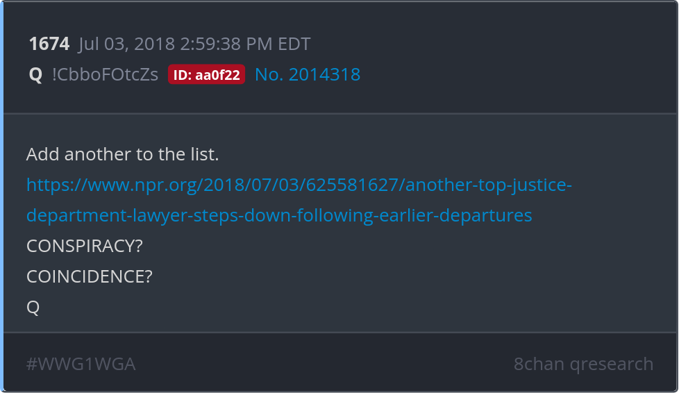 CONSPIRACY? COINCIDENCE? https://www.npr.org/2018/07/03/625581627/another-top-justice-department-lawyer-steps-down-following-earlier-departures Posted 07/02/2025 09:07 PM Categories Clips, Q