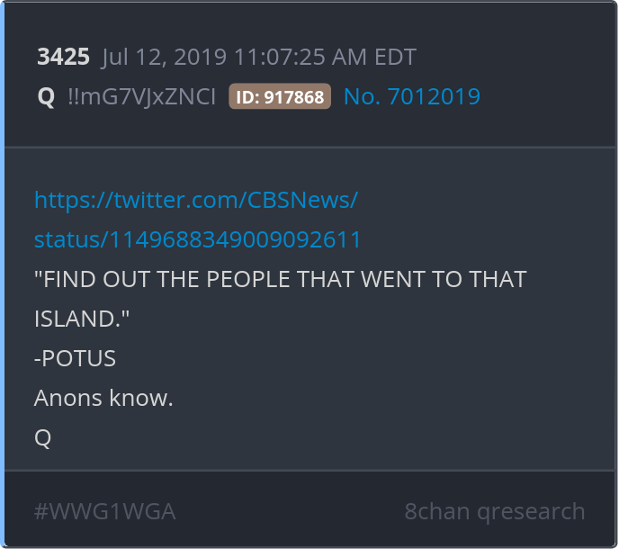 "FIND OUT THE PEOPLE THAT WENT TO THAT ISLAND." -POTUS https://twitter.com/CBSNews/status/1149688349009092611 Posted 07/11/2025 08:33 PM Categories Clips, Q